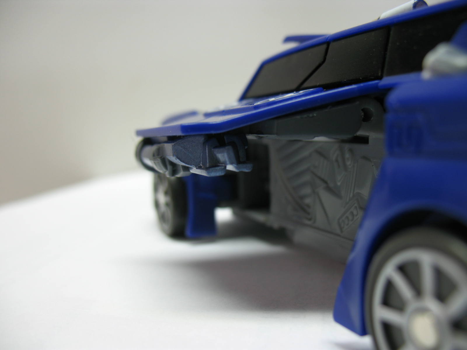 Onto the toy itself. Vehicle mode is very much like the Animated version of SW. it has most of the same details and mouldings as the RPM version as well, Cassette spindles in the doors, on/off button in the roof and some play/fwd buttons on the front grill. Paint decals are sparse, with white, little bits of gold and a black Decepticon insignia on the bonnet and rear of car. Oddly enough, there is another on the bottom of the car as well. The blue of the plastic is pretty spot on though and so no complaints there.