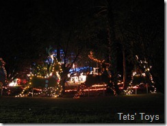 Ok, next on the list was a place that was a bit trickier to find, but once you were in the general vicinity it was hard to miss. The amount of garden it covered was HUUUUUUUGE! Around the corner of the house and all along the front, I believe you could compare it to the equivalent of three front yards in my opinion. These guys had a lot of lights set up and a good variety, but the balance wasn’t quite right and there were too many inflatable Santas kicking around the place. they do get points for having these cool triangle star thingies on the verge though and one must admit they did have a lot of space to cater for. Extra points for having a Christmas tree set up in the driveway too (it even had a toy train set up to run around it), but the train wasn’t on. I was impressed by the big wooden panels on the side of the fence that looked hand made of Santa in his sleigh with the reindeer working hard. They had lights on the outline as well. good work guys!!
