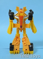 Here is where he looks the most yellow. There is a slight change in the yellow of the plastic from between the torso and the legs. He has a small bit of yellow paint around his combiner joint, which also adds the most colour to the robot mode. The silver highlights of the engine in vehicle mode are now on his ankles and the red from the spoiler has now become his toes and the only colour of the body that is kind of exciting. Although the lack of other colours does draw your attention to his head, and makes the small insignia on his chest noticeable. Rather cleverly, the black on the shoulders frames his head rather nicely I think, overall it works pretty well.