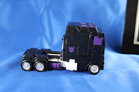 Paint work is ok. He has the silver grill and purple windows. On the top windows (of the sleeper section) there are some tech details sculpted in. These make more sense for robot mode as they cover his knees. Overall he looks pretty satisfactory, aside from the big white blocks on the side. They are there for the robot mode (I guess, they actually join into the underarms, so could have gotten away with being black). And it's kind of a shame as I'm sure that black would look good there, especially since he has the purple fuel tanks. It's nice to see that he has painted wheel rims. The little bits of white that go to the truck bed kind of break up the black a bit and would normally be obscured by the trailer.